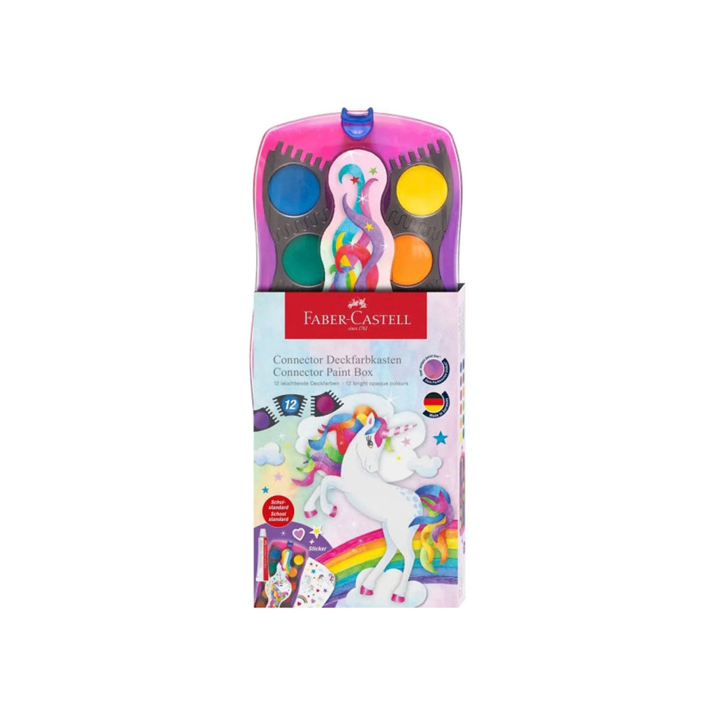Faber-Castell Connector Unicornio Pack de 12 Acuarelas en Pastilla + Pintura Blanca Opaca + Pegatinas - Gran Opacidad - Facilmente Mezclables - Colores Surtidos