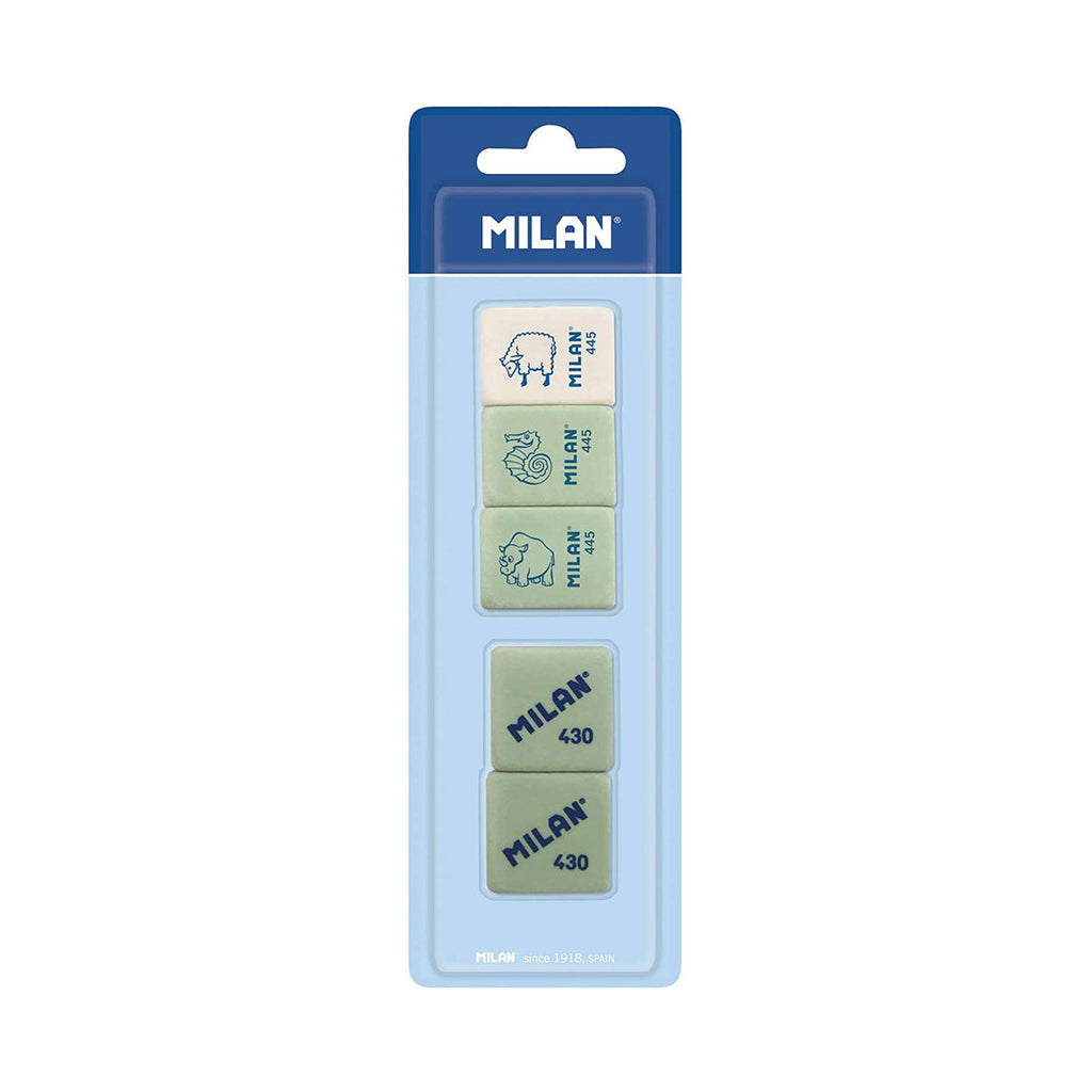 Milan Pack de 5 Gomas de Borrar, 3xGomas 445 Nata Rectangulares + 2xGomas 430 Cuadradas - Miga de pan - Caucho Suave Sintetico - Colores Surtidos