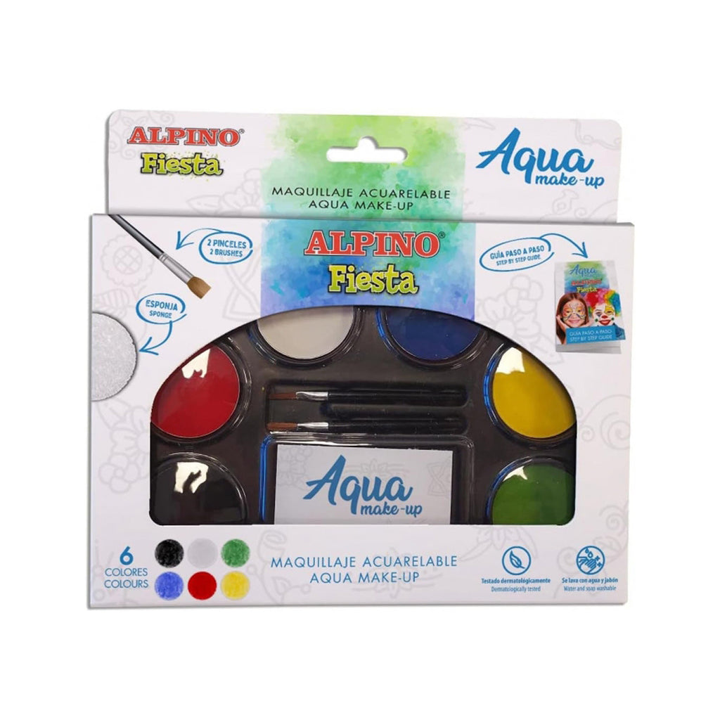 Alpino Fiesta Aqua Make-up Pack con Paleta de Maquillaje Acuarelable con 6 Colores + 2 Pinceles + Esponja y Guia de Uso - Se Lava con Agua y Jabon - Colores Surtidos