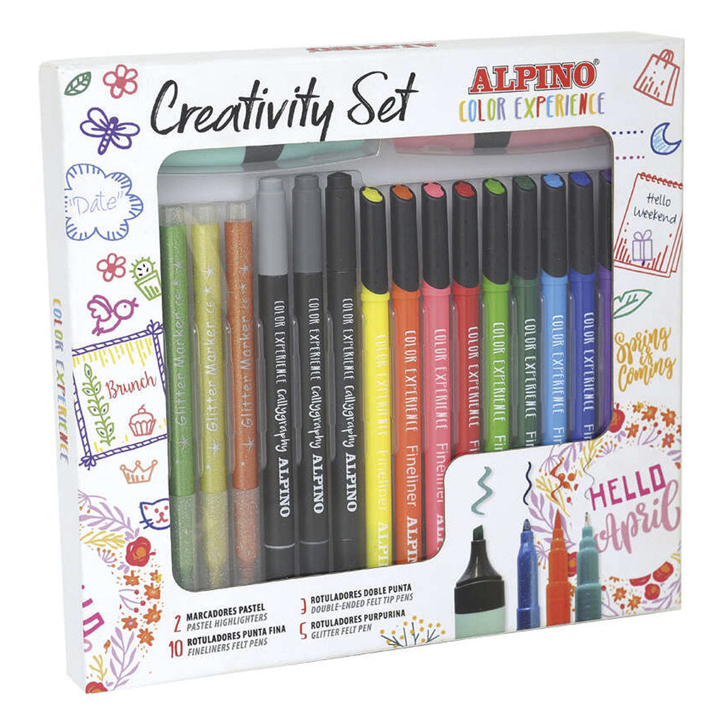 Alpino Color Experience Kit Creativo de 10 Fineliners - 5 Rotuladores Glitter Markers - 3 Rotuladores Especiales para Caligrafia - 2 Marcadores Pastel - Colores Surtidos