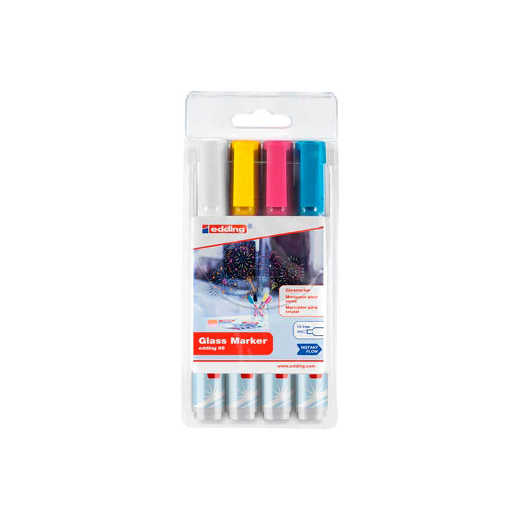 Edding 95 Pack de 4 Rotuladores de Tiza Liquida - Punta Redonda - Trazo 1.5-3mm - Colores Blanco, Amarillo, Rosa y Azul