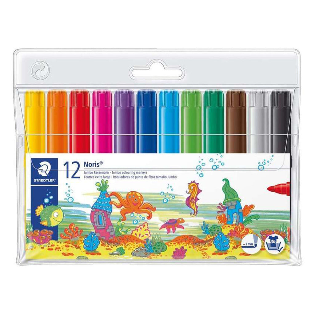 Staedtler Noris 340 Pack de 12 Rotuladores de Gran Tamaño - Trazo 3mm Aprox - Lavable Facilmente - Tinta Base de Agua - Colores Surtidos