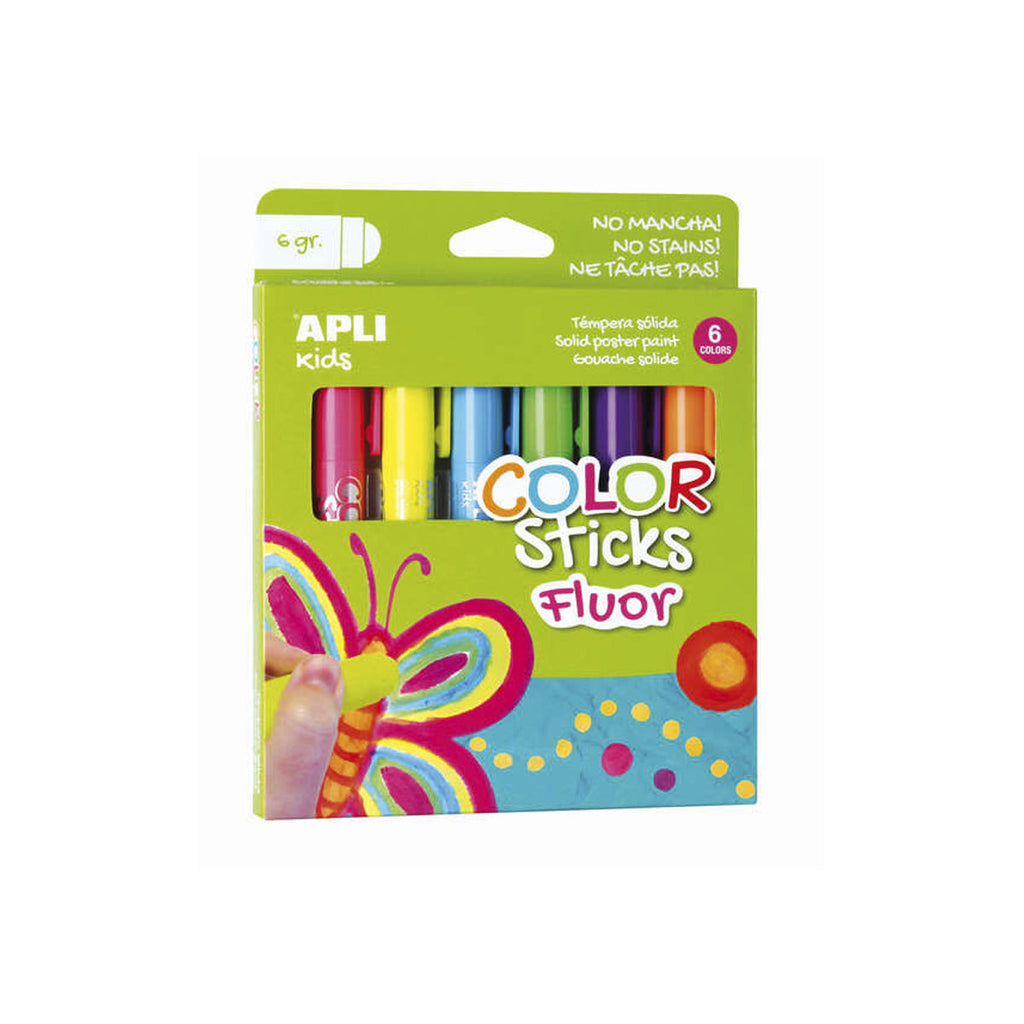 Las Témperas sólidas Color Sticks son un pack de 6 unidades de 6 g en colores fluorescentes surtidos: amarillo flúor, fucsia, azul flúor, verde flúor, naranja flúor y lila flúor. Son ideales para dibujar y pintar sobre papel, cartón, cartulina, etc. Los Color Sticks de APLI no manchan y tienen un acabado satinado, por lo que no necesitan barniz. Además, secan rápidamente, en menos de 3 minutos, y ofrecen colores nítidos, vivos e intensos.