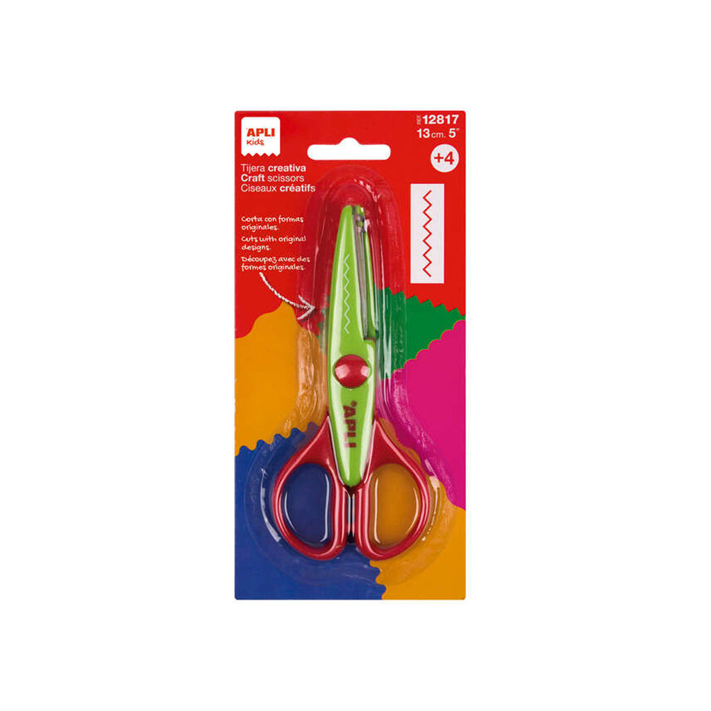 Apli Kids Zigzag Tijera de Acero Inoxidable 13cm - Realiza el Corte en Forma de Zigzag - Punta Redondeada - Uso Ambidiestro - Color Verde/Rojo