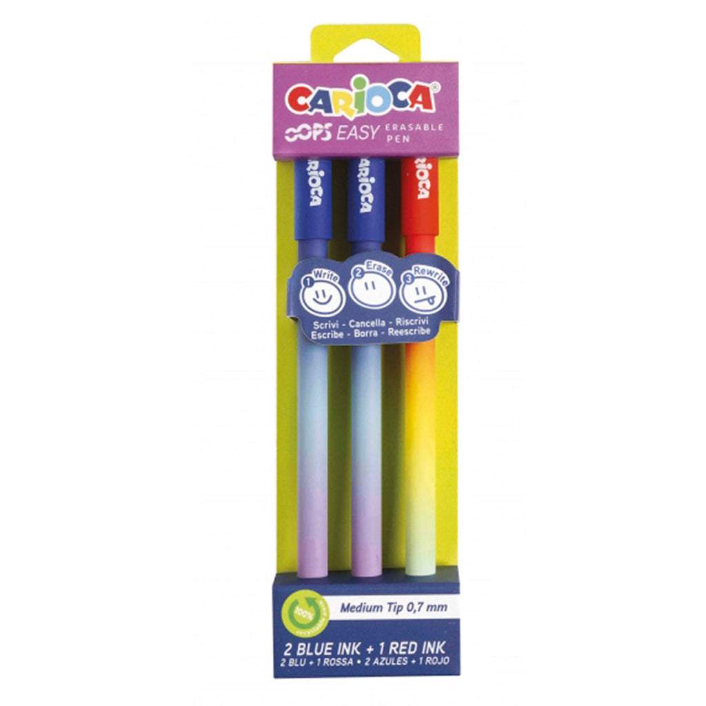Carioca Oops Easy Pack de 3 Boligrafos Borrables con Punta de Ø 0.7mm - Tinta Termo Sensible - Cuerpo con Efecto Degradado - Doble Goma - Colores Surtidos