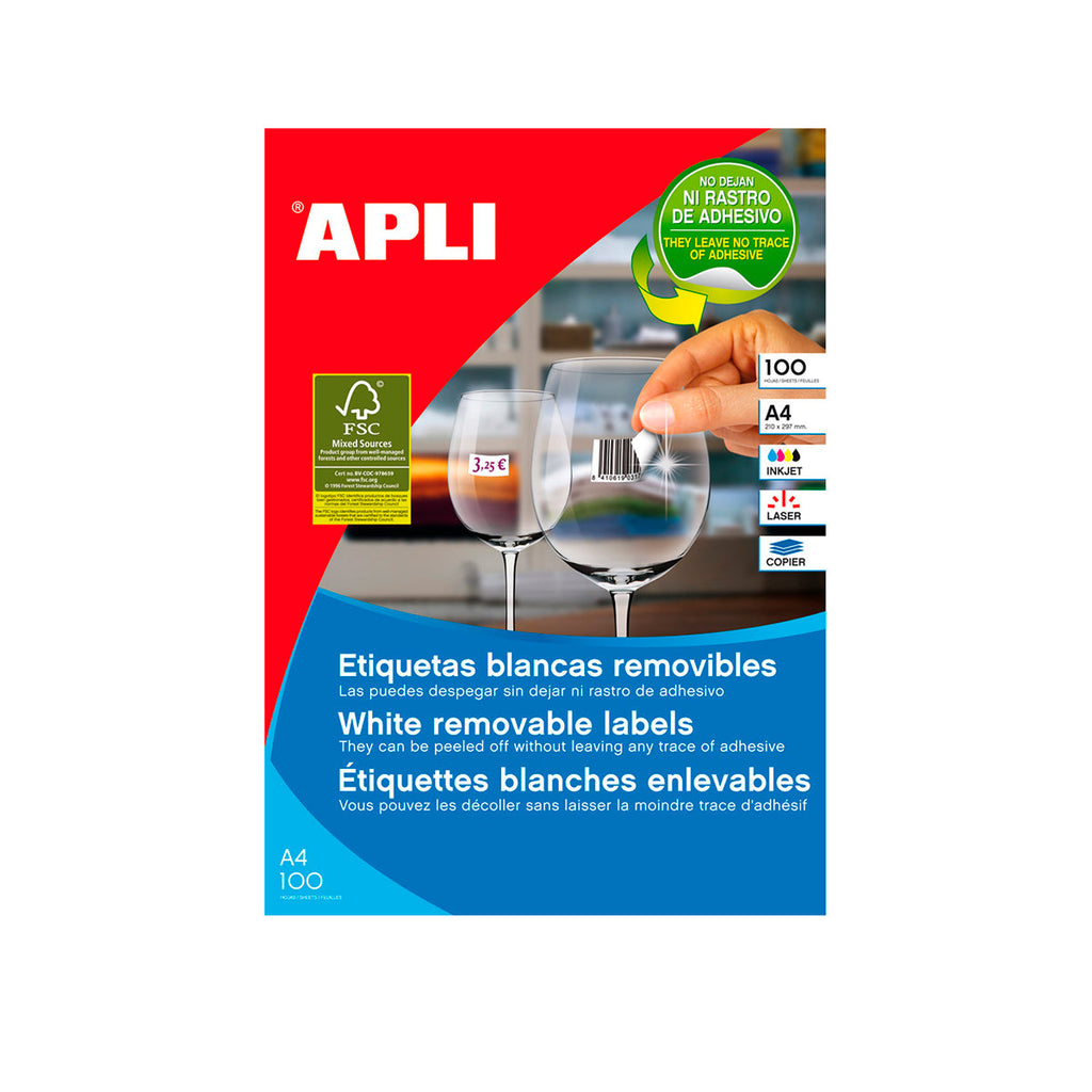 Etiquetas blancas cantos rectos tamaño 105,0 x 148,0 mm con adhesivo removible para múltiples usos. Pack con 100 hojas (400 etiquetas). El adhesivo removible permite retirar la etiqueta sin dejar rastro. Perfectas para identificar objetos, poner precio a productos, pegar sobre cristal o cerámica, etc. Excelente calidad de impresión en impresoras inkjet, láser o fotocopiadoras. Descarga el software gratuito para diseñar e imprimir todo tipo de etiquetas en www.apli.com